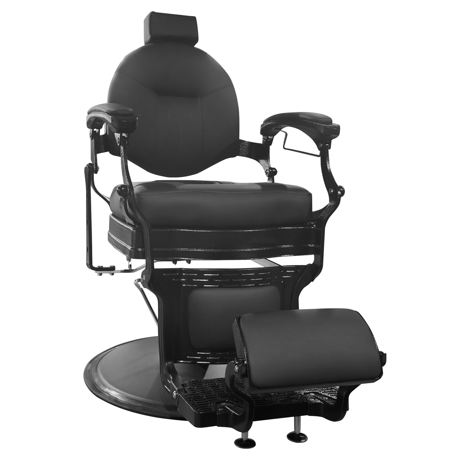 - Heavy-Duty Construction - Adorned with gold-plated aluminum accents, this professional salon chair is built for stability, featuring two stabilizing feet on the footrest and a sturdy 27-inch diameter base. These elements ensure excellent balance when reclining and can easily support larger clients. The footrest offers versatility with a reversible section that can be padded or left as metal.